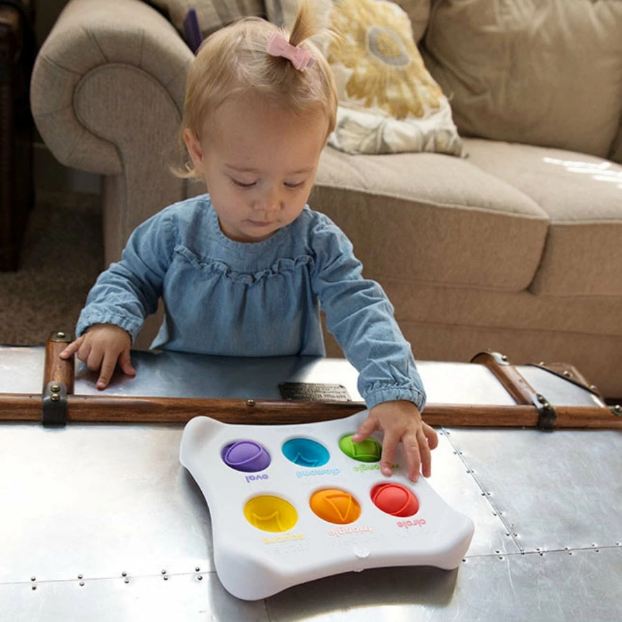 On one side, each silicone button is embossed with a different shape and labeled with its matching word in English. When the child flips the whole thing over and this time, the buttons are smooth and the words match the colours!