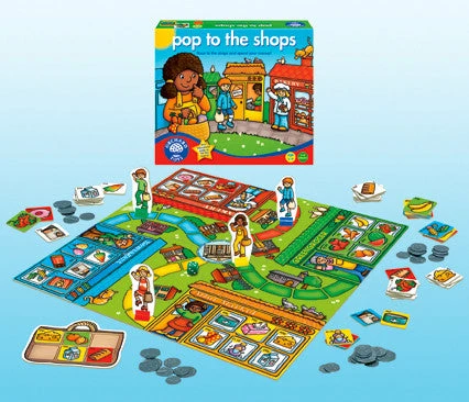 Go around the board from shop to shop, using plastic money to buy lots of different items.